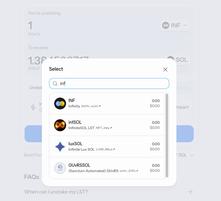 The Infinity liquidity pool — A multi-LST liquidity pool that holds a basket of different liquid staking tokens. When you unstake, Sanctum can tap into this shared liquidity instead of relying on a single LST's trading pair.