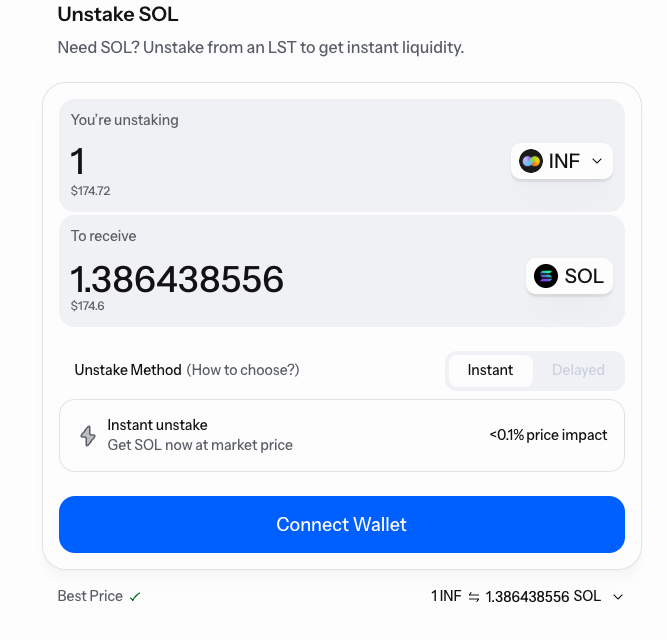 Traditional unstaking on Solana requires waiting for the current epoch to end. That's a 2-3 day wait. And if you're holding an LST from a smaller protocol, finding liquidity to swap back to SOL can mean high slippage and bad prices.